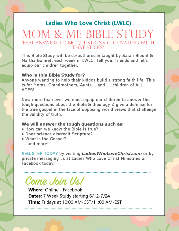 This Bible Study will be co-authored & taught by Sarah Blount & Martha Bonnett each week in LWLC. Tell your friends and let’s equip our children together.